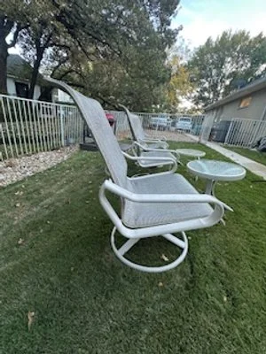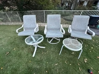 Samsonite Chesapeake Series Leisure Chairs # 9250 and round 18” side table. This classic and timeless furniture from the 1980’s and 1990’s is quality built with welded steel frames and durable PVC Coated on exterior